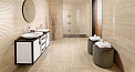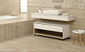 Рисунок коллекции имитирует травертин — благородную текстуру природного камня с мягкой вариативностью оттенков, при этом вид декора отмечен как «геометрия», что предполагает наличие упорядоченных узоров или вставок на фоне каменного рисунка. Такое сочетание делает коллекцию уместной в современных и классических интерьерах ванных комнат, где требуется сочетание природного эффекта и строгой структурности.