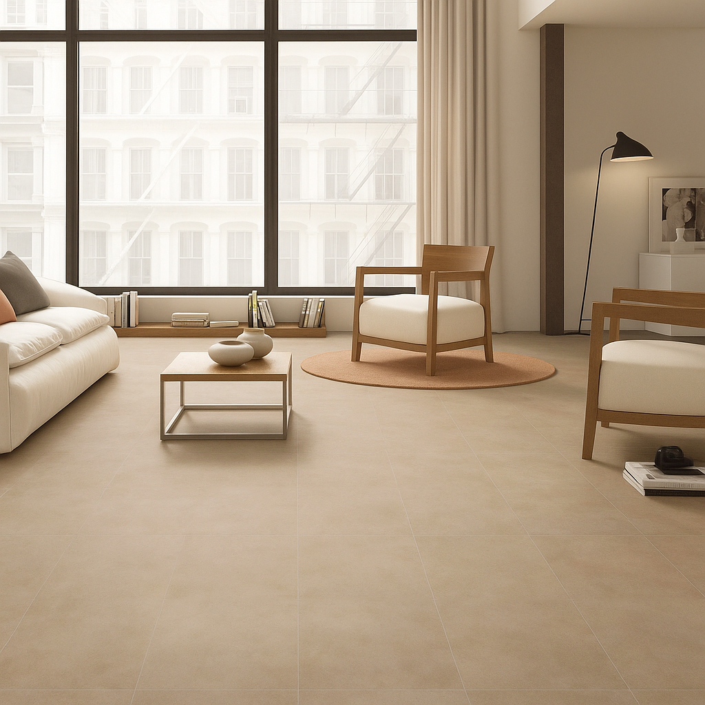 Керамогранит из коллекции Como от BOBO предложит спокойную, теплую базу для холла: бежевый тон с тонким рисунком под бетон создаёт ощущение легкой фактуры без холодной монотонности. Широкоформатные прямоугольные плиты 1200×600 мм формируют ровное полотно с минимальными линиями швов, визуально расширяя пространство и подчёркивая строгую геометрию интерьера.