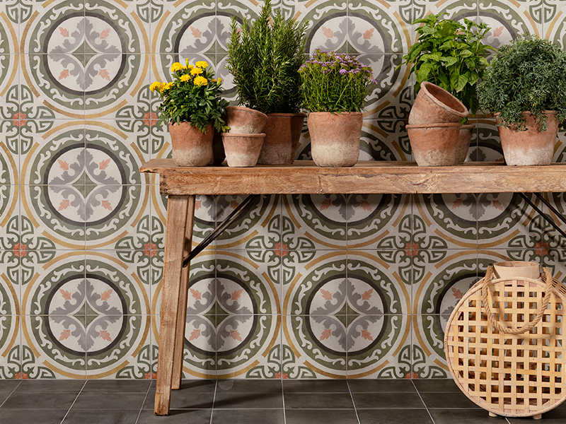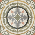 Формат 450×450 мм помогает сохранить масштаб рисунка при небольшом пространстве: плитка выглядит цельно и аккуратно, швы образуют дополнительную геометрию. Матовая фактура приглушает блики и делает пол визуально благороднее, особенно в сочетании с приглушёнными стенами и текстурой дерева.