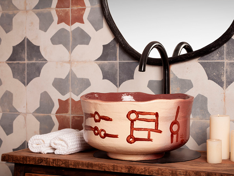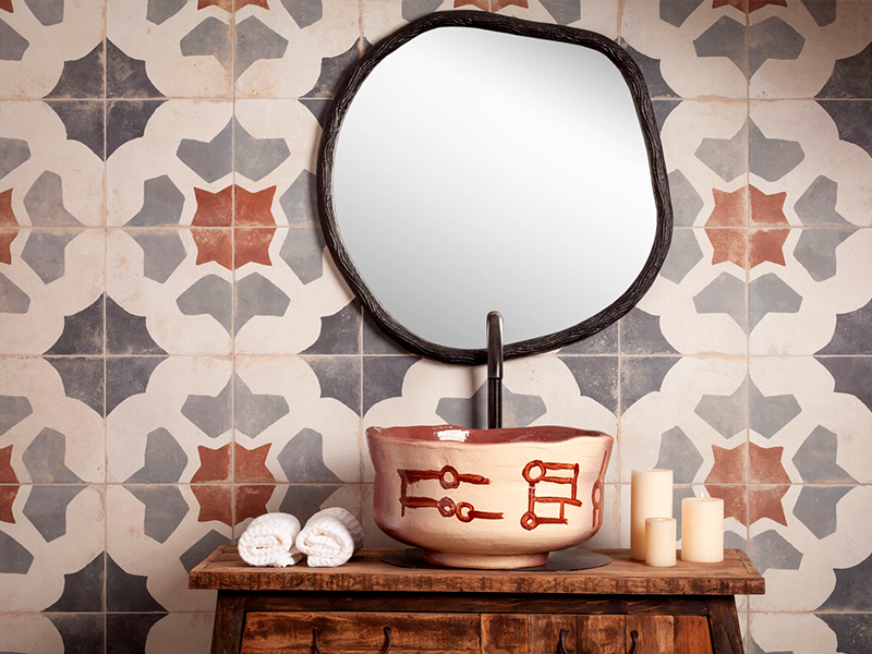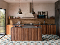 Вид декора — сочетание каменной фактуры и геометрического орнамента. Это позволяет плитке работать и как основа, и как выразительный полупаттерн: в холле крупный формат задаёт ритм, а геометрические акценты помогают ориентировать пространство и усиливают ощущение порядка при входе.