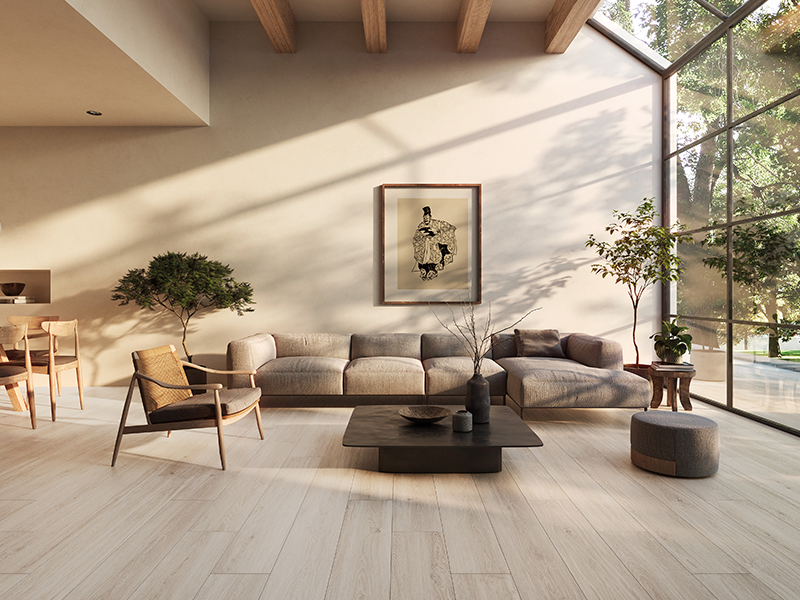 Керамогранит LENK от Peronda передаёт спокойную теплоту натурального дерева в бежевой гамме, сохраняя практичность камня. Матовая поверхность мягко рассеивает свет, не создавая бликов, что особенно удобно в прихожих и холлах с переменным освещением.