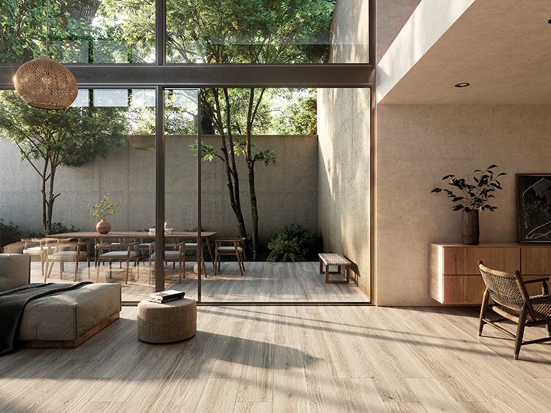 Керамогранит LENK от Peronda передаёт спокойную теплоту натурального дерева в бежевой гамме, сохраняя практичность камня. Матовая поверхность мягко рассеивает свет, не создавая бликов, что особенно удобно в прихожих и холлах с переменным освещением.