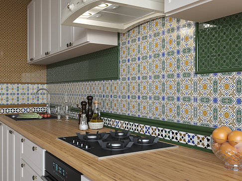 Коллекция Марокко от Керамин — керамическая плитка с глянцевой поверхностью. В декоре сочетаются флористические и геометрические мотивы, присутствуют рельефные элементы и фактура, напоминающая ткань. Базовая палитра включает белые, синие, зелёные и чёрные оттенки, рисунок выраженно декоративный и текстурированный.
