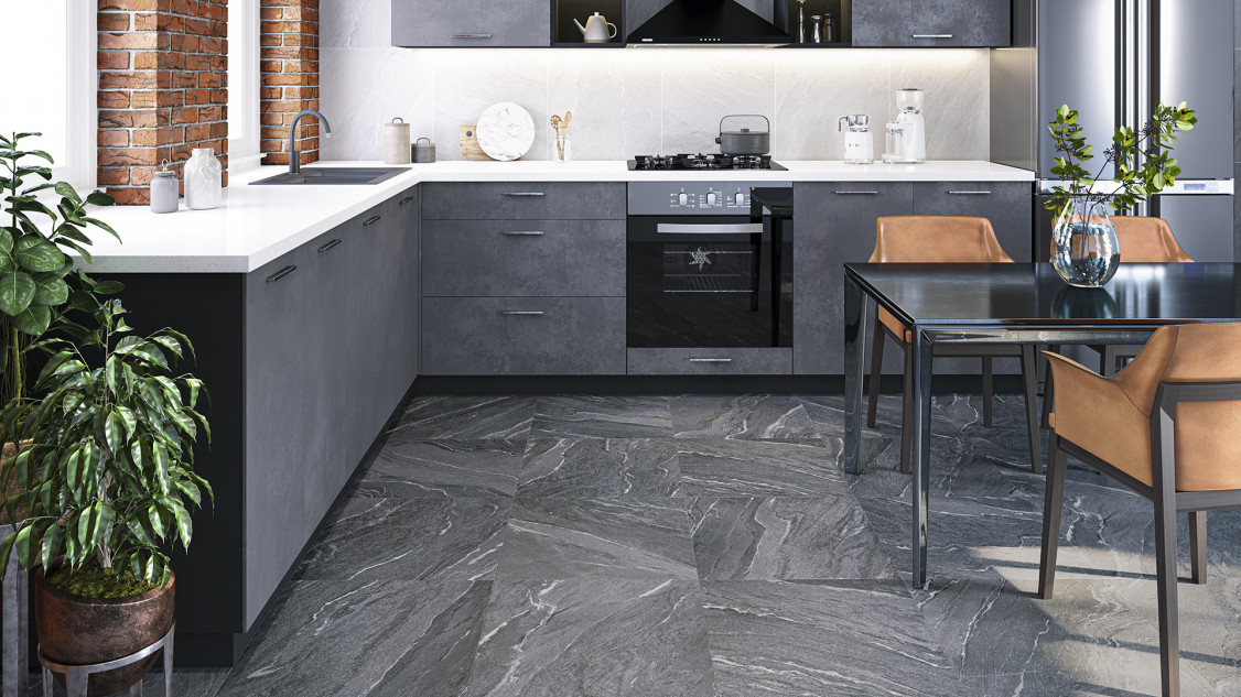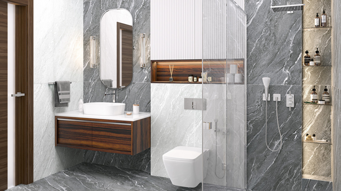 Материал — керамогранит, что гарантирует устойчивость к влаге и механическим нагрузкам, стабильность геометрии и удобство в эксплуатации. Матовая поверхность снижает блики и обеспечивает приятную тактильность, при этом визуально имитирует природный камень, сохраняя ровный тон и текстуру без орнаментальных решений. Отсутствие декора делает коллекцию универсальной для сочетания с мебелью и сантехникой разных стилей, от минимализма до современного классицизма.