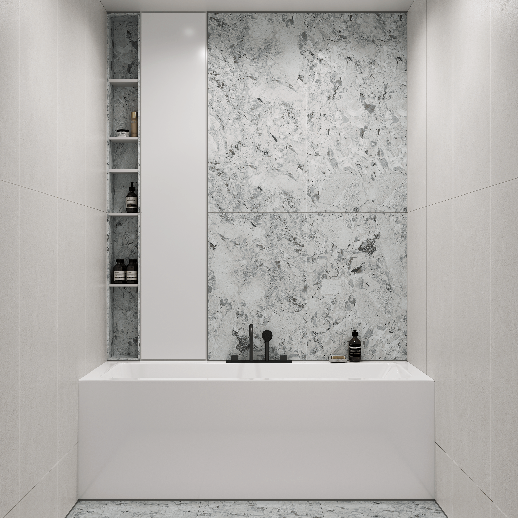 Коллекция SKETCH от NT Ceramic переносит индустриальную эстетику в жилое пространство — белый керамогранит с мягким бетонным рисунком формирует спокойный фон для мебели и света. Матовая поверхность приглушает блики, поверхность выглядит однородно и в то же время живо за счёт рисунка, имитирующего структуру цемента.