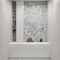 В коллекции представлено несколько вариаций рисунка, что даёт возможность комбинировать плитки в тон или выбирать более контрастные фрагменты для акцентов. Белая база нейтральна: она подчёркивает архитектуру пространства, хорошо сочетается с деревом, матовым металлом и тёплыми текстилами, не перегружая композицию.