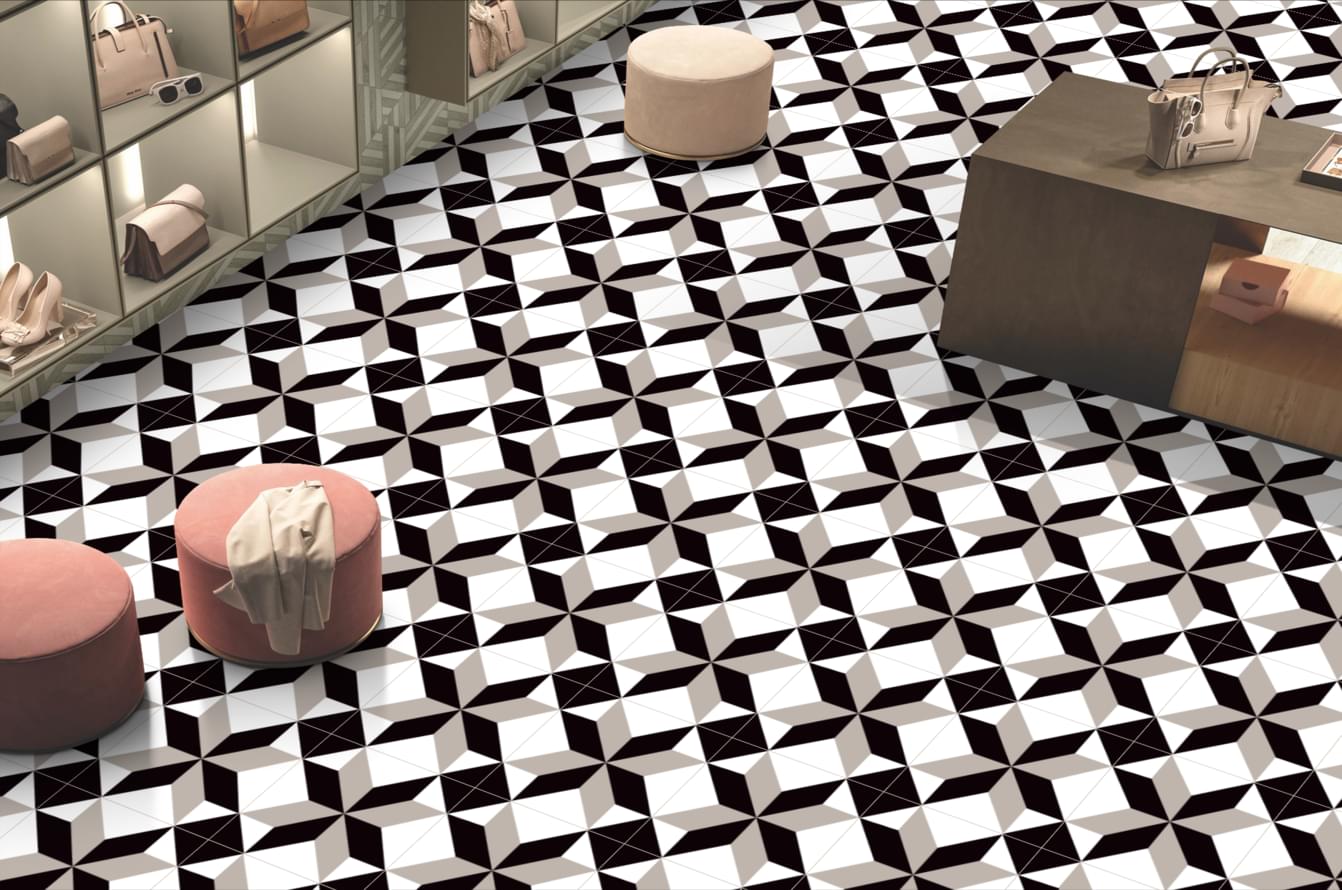 Коллекция рекомендована для общественных и жилых помещений, в частности для прихожих и коридоров, где важны прочность и нейтральный визуальный эффект. Матовая фактура снижает отражения света и визуально смягчает контраст между белыми и чёрными элементами.