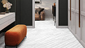 Узкая, вытянутая форма плитки визуально удлиняет помещение, подчёркивает направление укладки и делает пол «направляющим» элементом интерьера. Древесный мотив в нейтральной белой гамме легко сочетается с тёплыми и холодными оттенками мебели и сантехники: от светлого древесного шпона до матового графита. Геометрические детали в рисунке добавляют современности, сохраняя при этом текстурную натуральность.