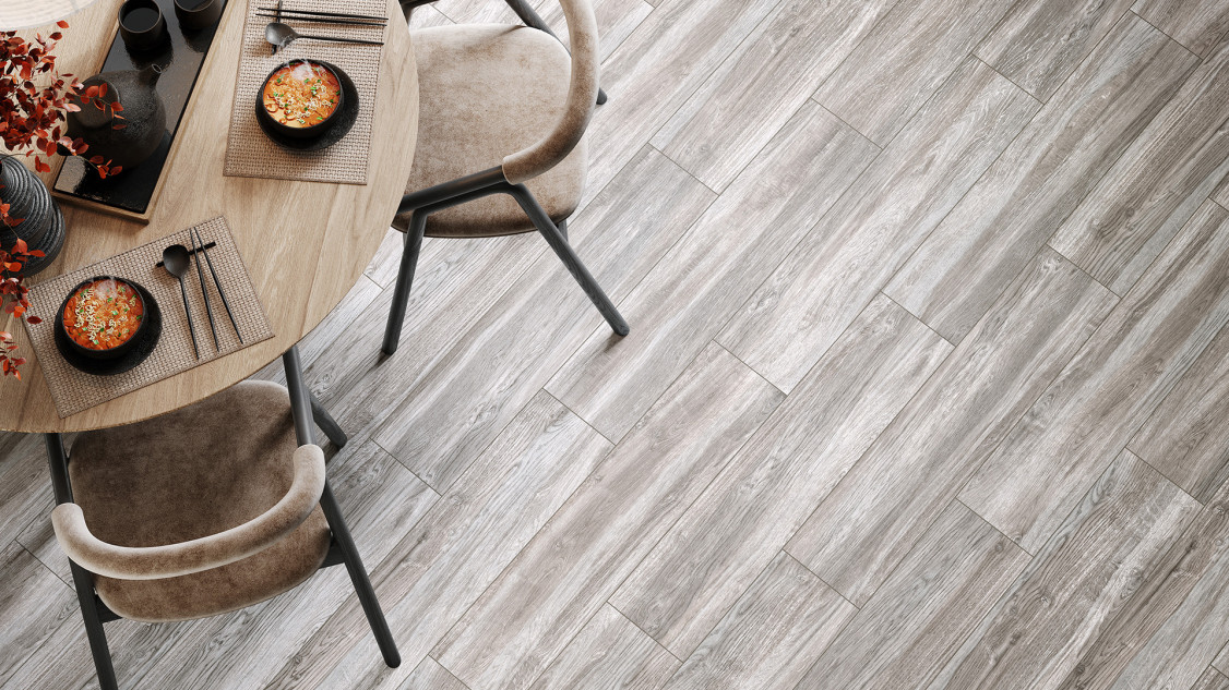 Керамогранит Chester от Alma Ceramica в формате 200x900 — это спокойная серая база с приглушенной текстурой дерева и аккуратным геометрическим декором. Удлинённые пластины задают горизонтальный ритм, визуально удлиняя пространство ванной комнаты и создавая ощущение порядка без лишней выразительности.