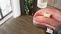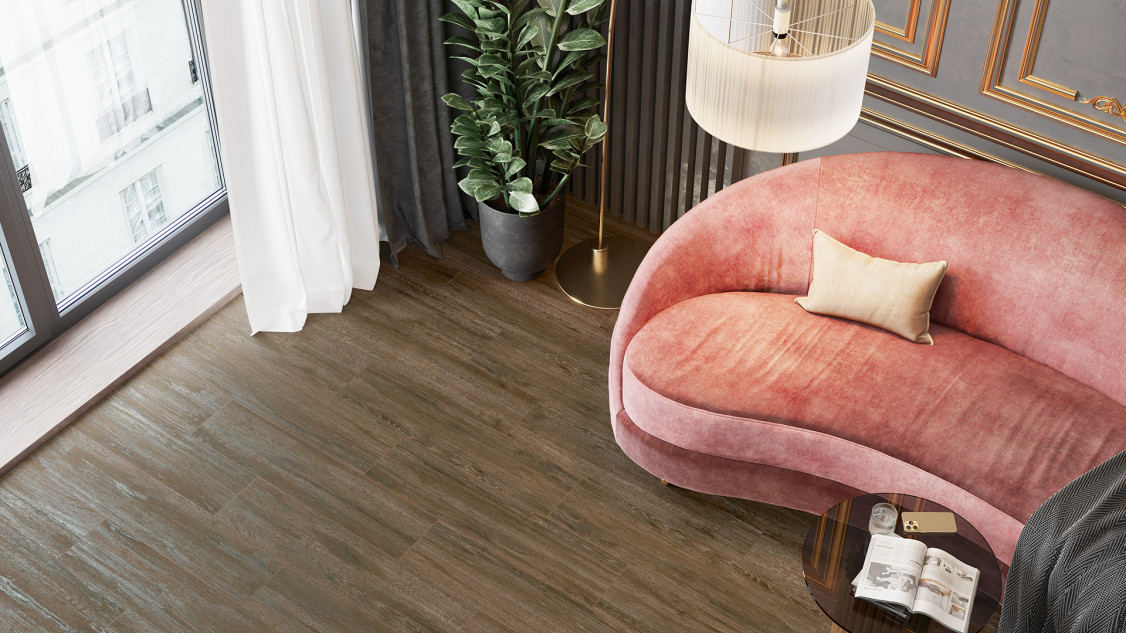 Керамогранит Grandwood от Alma Ceramica — длинные плитки 200×900 мм с тёплым коричневым тоном и матовой поверхностью. Фактура имитирует натуральную древесину, но без выраженного блеска; рисунок подчёркнут нитями «волокон», которые при внимательном взгляде складываются в ритмичную геометрию полотна.