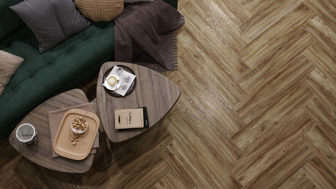 Керамогранит из коллекции Sanray от Alma Ceramica предстает в виде длинных плиток формата 200×900 мм в тёплой коричневой гамме. Матовая поверхность передаёт мягкость натурального дерева, а графичные геометрические вкрапления добавляют композиции современный ритм — сочетание фактуры и рисунка делает покрытие одновременно уютным и выразительным.