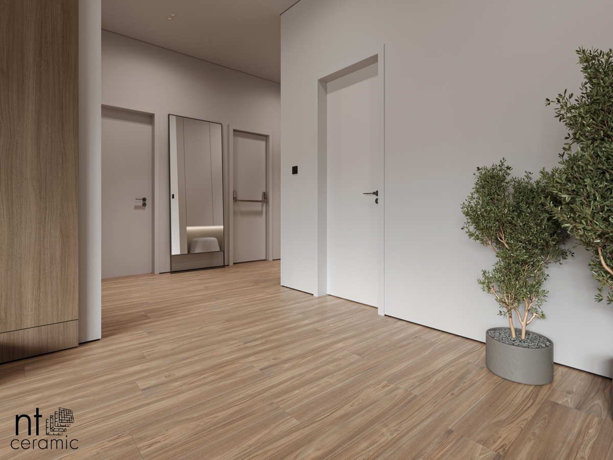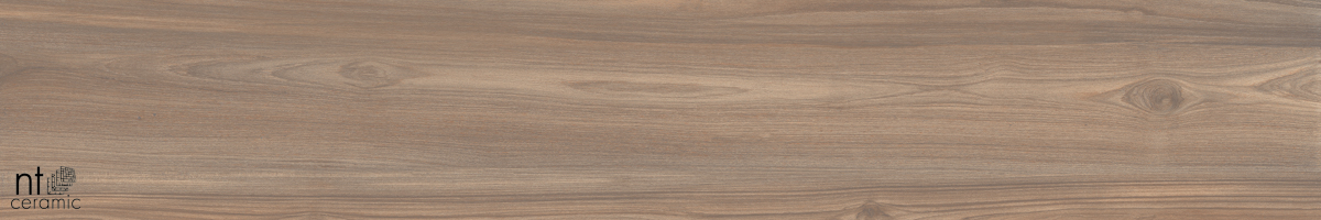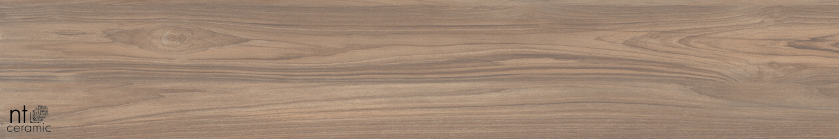 Керамогранит из коллекции Wood Honey от NT Ceramic воспроизводит тёплую фактуру древесины в крупноформатной плитке 200×1200 мм. Матовая поверхность и коричневые оттенки создают мягкий, приглушённый характер покрытия, где рисунок доски читается естественно: годичные кольца и лёгкая «волна» текстуры сохраняют ощущение натурального дерева без лишней выразительности.
